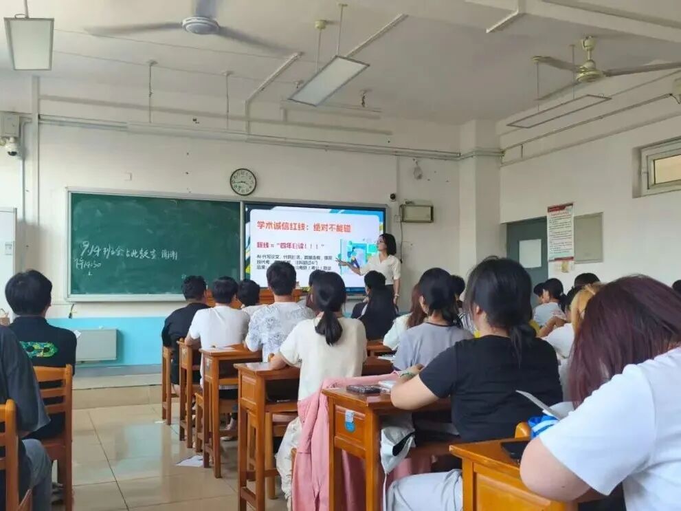 辅导员以班会形式为新生讲授“开学第一课”,内容紧扣入学教育核心。理想信念教育中,通过交流与引领,鼓励新生“志存高远、脚踏实地”,筑牢思想根基;入学适应与学涯规划环节,引导观看“学习压力调适”“效率提升策略”等微课,指导制定学业目标,助力角色转变;安全教育结合案例,重点开展防电信诈骗、交通与校园安全、防盗、消防及宿舍用电规范教育,强化防护能力;还融入心理疏导与劳动实践引导,促新生全面成长。
