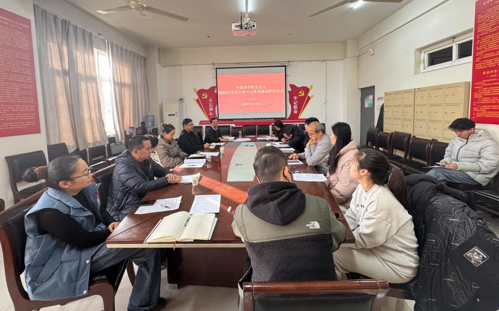 1月14日下午,外国语学院党总支召开2025年度基层党支部书记抓党建述职评议会,学院党总支委员会成员、党支部书记、科级干部、师生党员代表、民主党派代表参加。会议由党总支书记武江波主持。